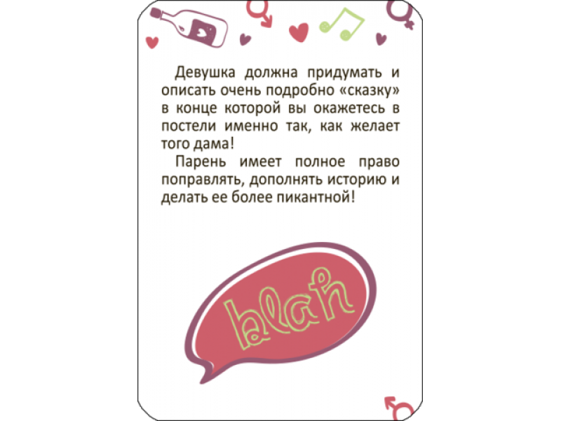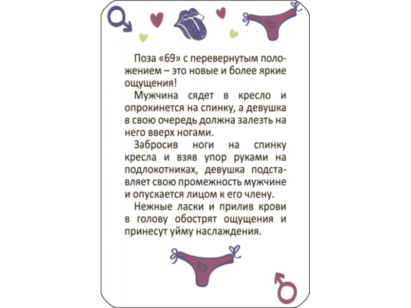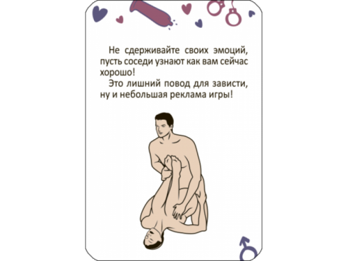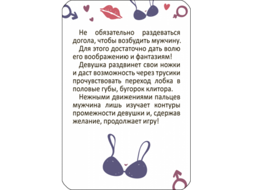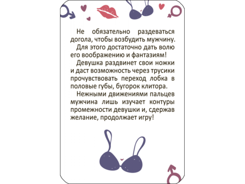 Некоторые карты могут попросить вас и вашего партнера совершить определенные половые акты или попробовать новые позы. Другие могут включать поддразнивание или прелюдию, предназначенные для того, чтобы создать предвкушение, прежде чем приступить к делу. А третьи могут включать более интимные действия, такие как поцелуи или объятия.