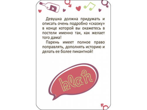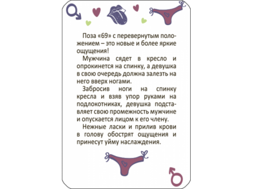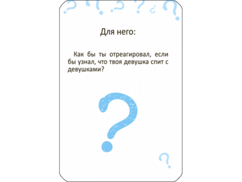 Следует отметить колоду с вопросами. Она наделена особым статусом в игровом процессе. Карточки из нее берутся только при условии выпадения определенного сектора на поле. Бесценность полученной от партнера информации, поможет доставить ему неземное блаженство при начале сексуальных развлечений.