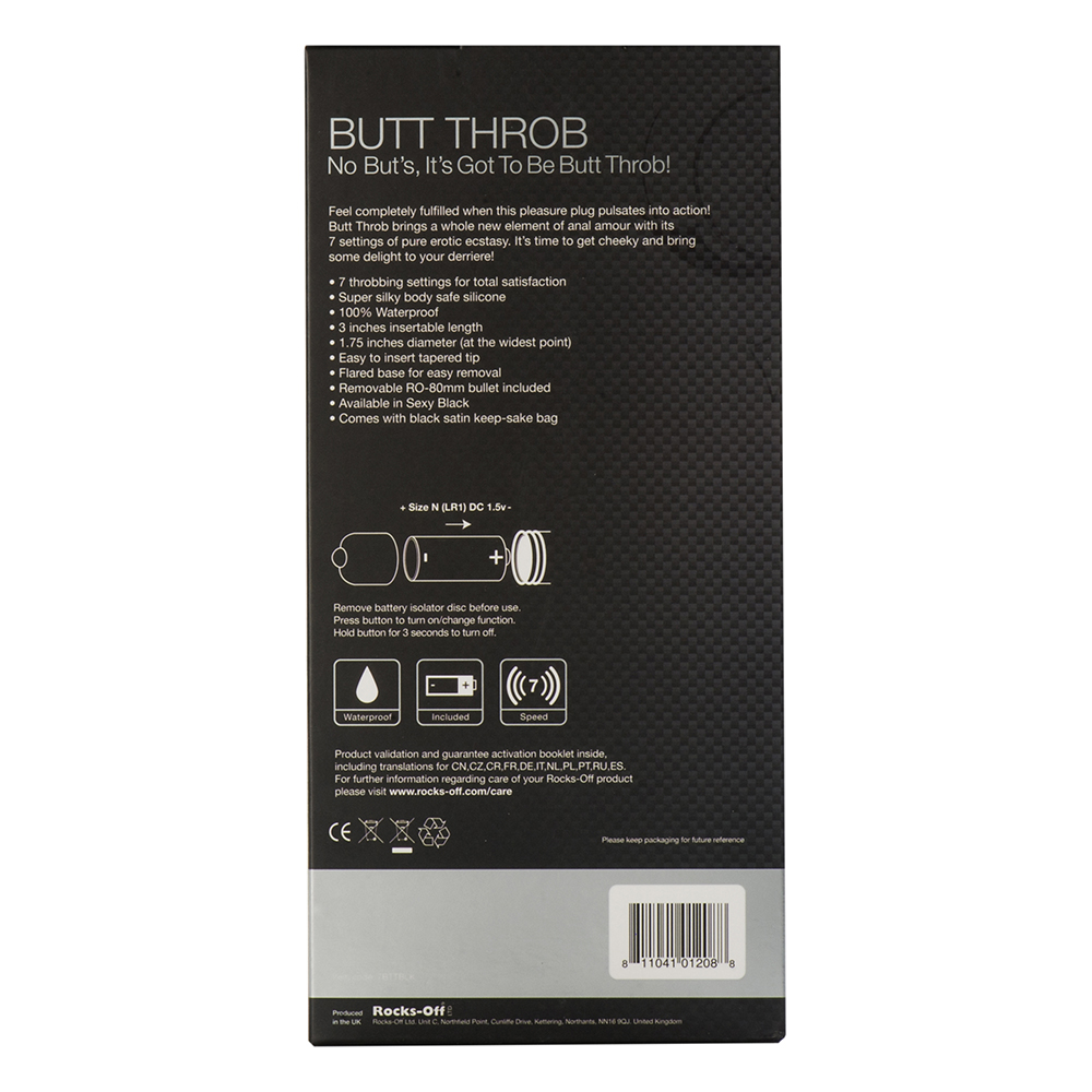 Rocks Off Butt Throb длиной 9,5 см идеально подходит как для новичков, так и для опытных пользователей. Его гладкий дизайн позволяет легко вводить его в задний проход, а его мощные вибрации обеспечивают интенсивную стимуляцию, которая доставит вам чувство удовлетворения и удовлетворения.
