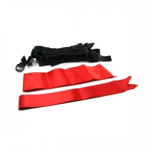 Набор для игры у двери S&M Door Play Kit. Материал - полиэстер и полипропилен. Длина каждой стропы - 4 м 88 см, длина каждой ленты для связывания - 71 см, длина повязки на глаза - 1 м 27 см.