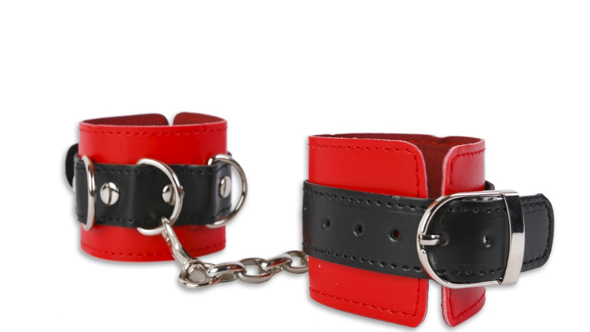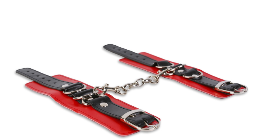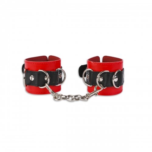 Выполнены красно-черные наручники из искусственной кожи высокого качества. Материал весьма прочный, безопасный для здоровья и позволяет коже дышать.
