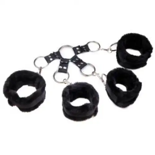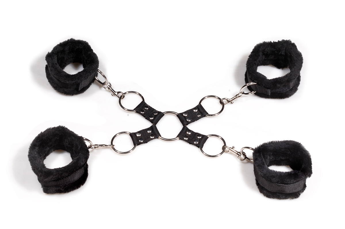 В набор входят 2 пары манжет с мехом с прикрепленными к ним карабинами-защелками. Ремешки присоединены к специальной крестообразной конструкции, которая состоит их колец и нейлоновых пряжек.