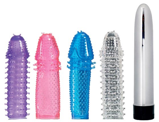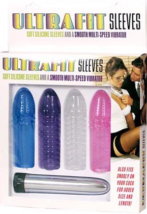 Комплект ULTRAFIT SLEEVS. Cостоит из серебристого вибратора с четырьмя гелевыми текстурированными насадками. Вибратор мультискоростной, с плавной регулировкой режимов вибрации. Длина вибратора - 17 см, диаметр - 3 см.