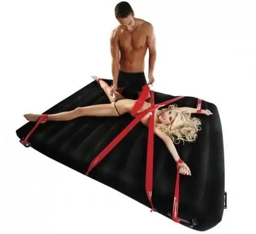 В набор вместе с надувной кроватью идут различные секс-игрушки и аксессуары. Вы сможете попробовать БДСМ-практики, ведь в наборе доступны специальные завязки для рук и ног, которые позволят попробовать абсолютно любые позы в сексе и испытать оргазм за оргазмом. В наборе есть 4 пары наручников с декором, которые позволят воплотить интересные фантазии и полностью удовлетворить вашего партнера.