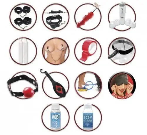 Вибромассажер, который идет в комплекте, имеет несколько режимов и доставить дополнительную стимуляцию во время интимных развлечений. В наборе вы сможете найти ароматические свечи, ремни и специальный скотч для связывания эротические зажимы для сосков, которые отлично подойдут для ваших развратных игр со второй половинкой.