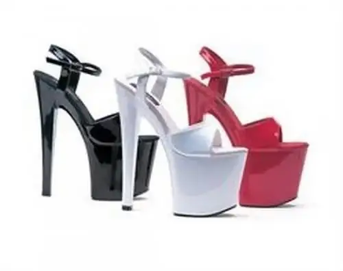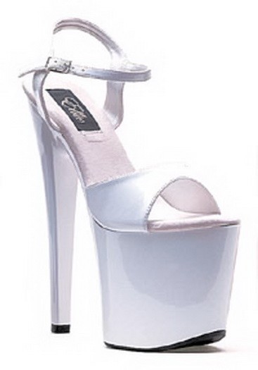 Яркие женские туфли белого цвета. Высота каблука - 20 см, высота платформы - 10 см.