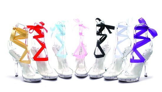 Женские босоножки с завязками. В наборе 7 ленточек: розовая, жёлтая, фиолетовая, белая, голубая, чёрная и красная. Высота каблука 13,0 см.